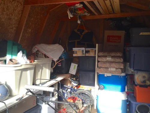 If you remember, our shed was uber chaotic before the organizing commenced. Here's a before photo to kick in your anxiety. ;)