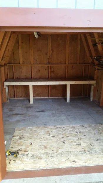Mr. Handy Pants Husband built a shelf along the back wall of the shed. Previously, we had our storage bins just stacked on top of one another. It was a nightmare to get to anything and required creative tub-shuffling to get anything in and out. We already had all of this lumber on hand, so the cost to add was nearly "free". Also, in the shot below, you'll notice the new subfloor we replaced in Week 3 in the front half of the shed. While it would have been nice to replace all subfloor, we opted to leave the rest as-is since it was not sinking or crumbling beneath our feet.